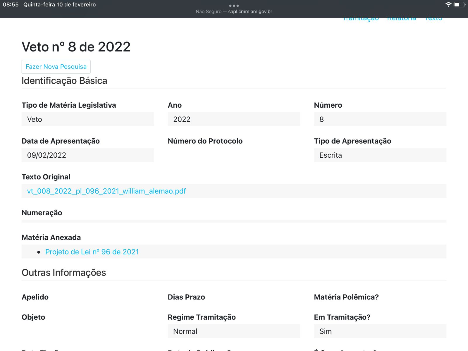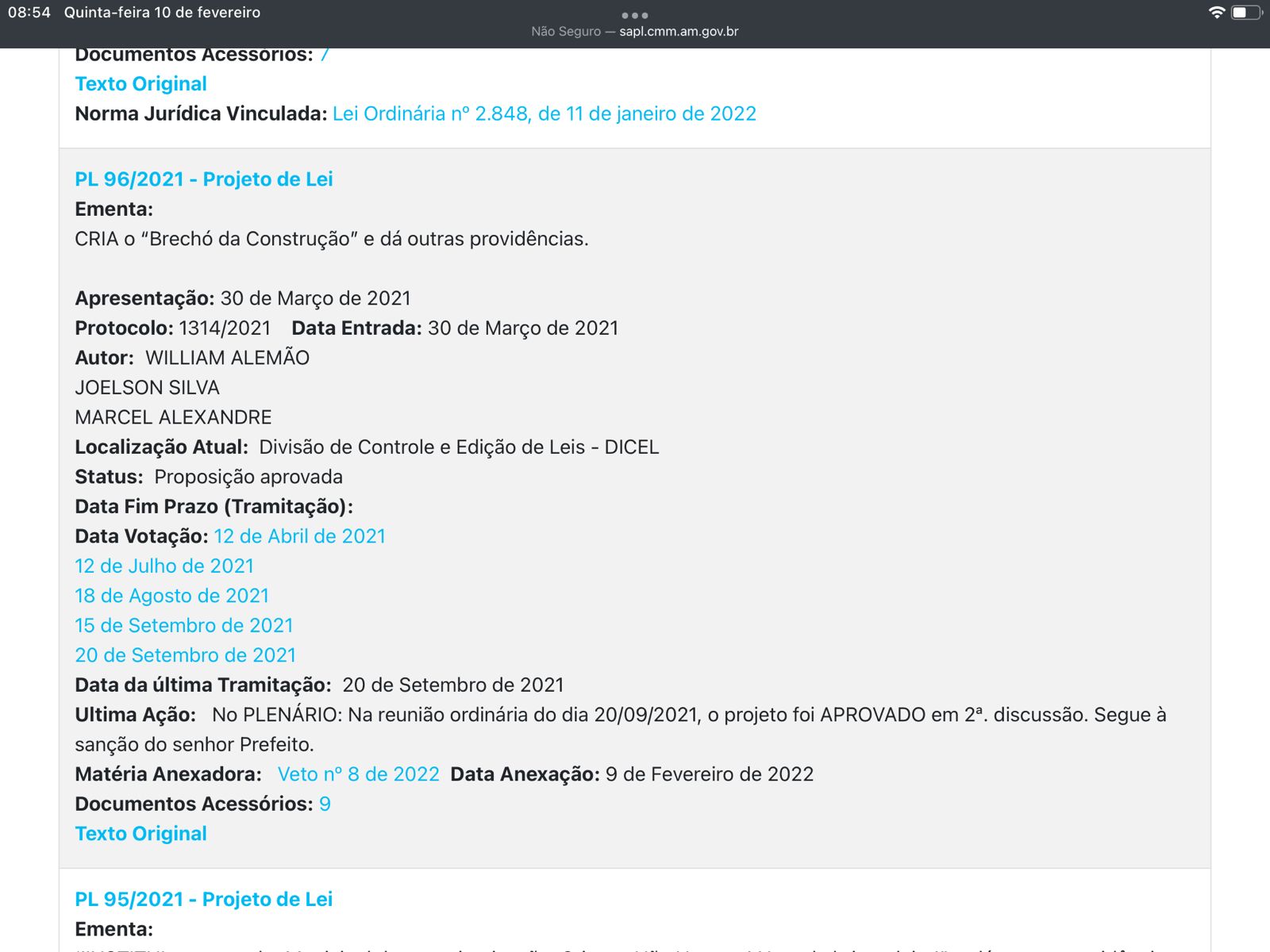 “Ocorre que um Projeto de Lei do vereador Willian Alemão (Cidadania) foi aprovado pelo plenário da Casa e encaminhado para o Executivo sancionar ou vetar o projeto. Isso ocorreu em setembro do ano passado, porém, até a manhã desta quarta-feira (9/2/22), não havia notícia nem de um veto, nem de uma sanção, ou seja, pode ter havido a sanção tácita. Segundo a Lei Orgânica do Município de Manaus (Loman), no seu artigo 65, parágrafo 8°, a inércia do Presidente nesse caso resulta em perda de mandato por não cumprimento de dever: