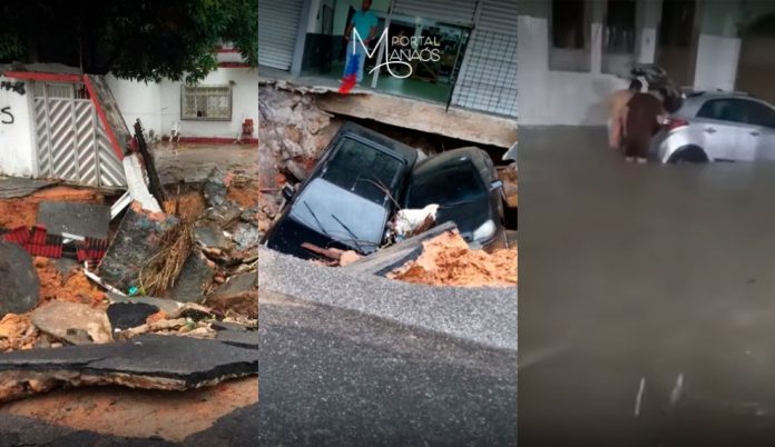 A forte chuva que caiu em Manaus na madrugada desta quinta-feira, 1º/12, causou alagamentos e desabamentos em diferentes pontos da cidade. Na zona Sul uma cratera se abriu em uma parte da Rua Delfin de Souza, próximo a Avenida Silves, no bairro Petrópolis.