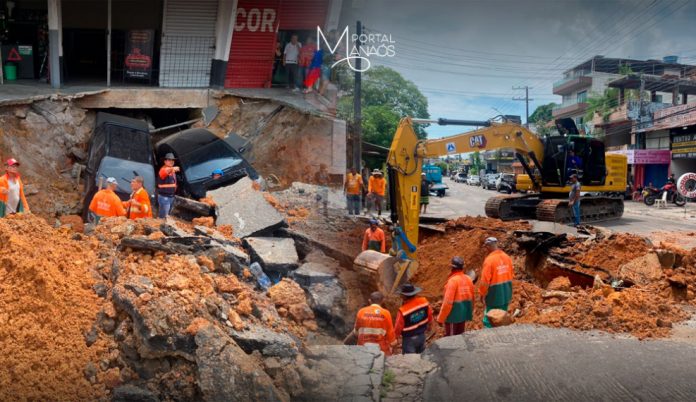 “As equipes técnicas da Seminf trabalham desde ocorrido e identificaram a extensão do problema, que foi ocasionado por construções irregulares em cima de um igarapé, inclusive um prédio de três andares, desviando o curso da água para cima da tubulação da prefeitura, fragilizando o solo, provocando a erosão e o afundamento da via”, explicou.