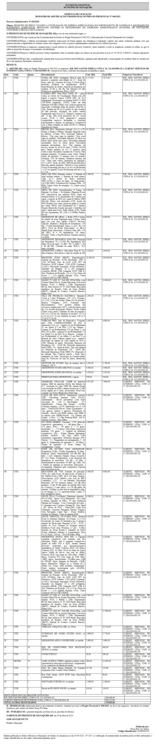 “Registro de Preço visando a contratação de empresa especializada em fornecimento de materiais e equipamentos eletrônico audiovisual destinado a atender as necessidades do Complexo Administrativo Municipal de Manaquiri”, diz trecho do despacho de homologação.