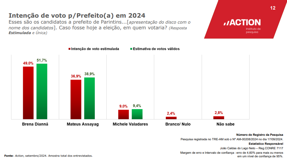 Em novo levantamento divulgado na última terça-feira (17) pelo Instituto Action Pesquisas, a candidata Brena Dianná (UB) aparece na frente da disputa pela prefeitura Municipal de Parintins, com 49,0% de intenção de votos. Segundo a pesquisa, a distância dela para o segundo colocado, Mateus Assayag (PSD), é de 12,1%. O candidato aparece com 36,9%.