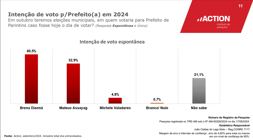 O levantamento foi registrado no Tribunal Superior Eleitoral (TSE) sob o número Nº AM-00208/2024. A Margem de erro da pesquisa é de 4,60% para mais ou menos em um nível de confiança de 95%.