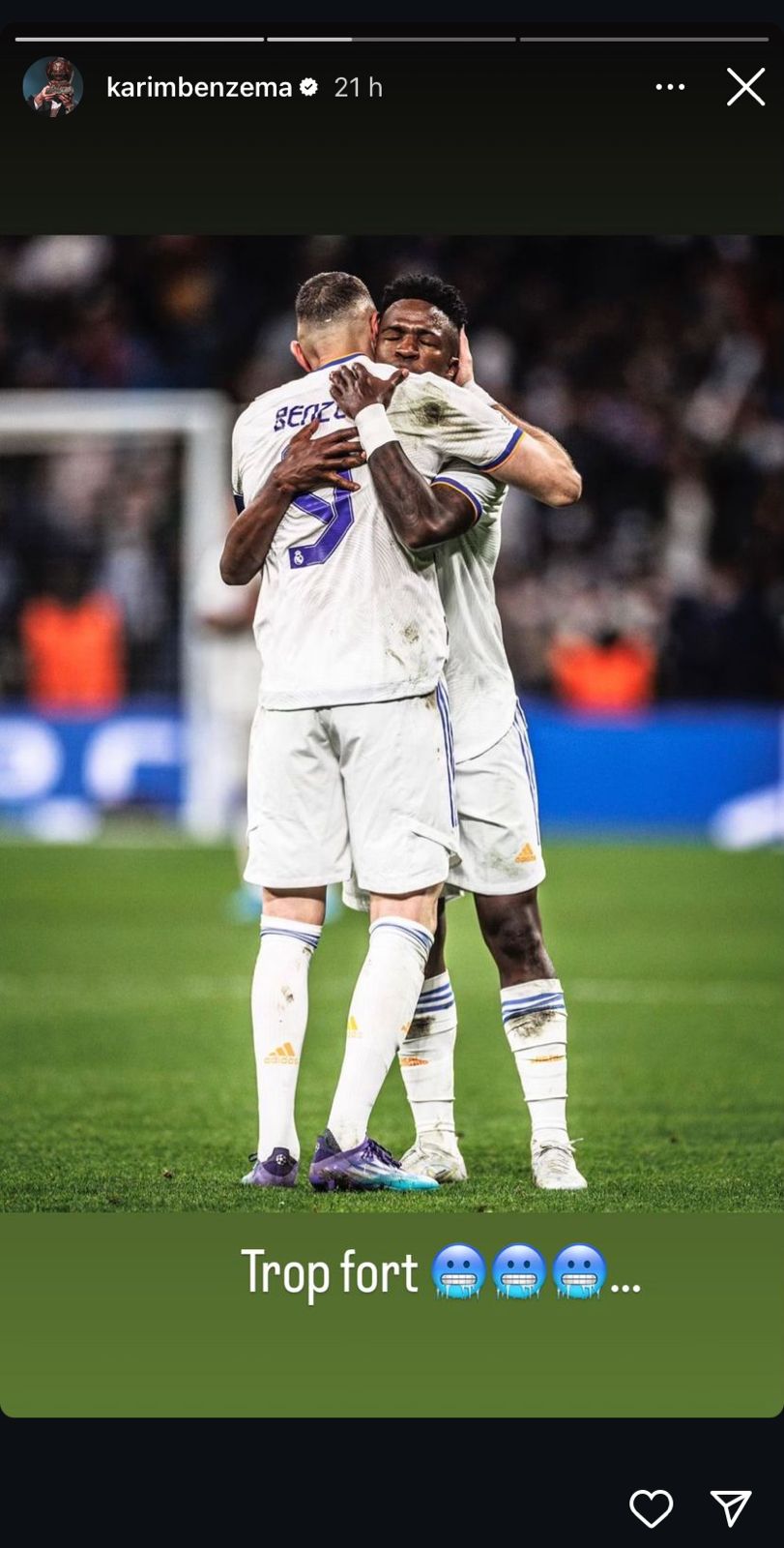 Ex-companheiro de Vinicius em Madrid e melhor do mundo em 2022, Karim Benzema publicou no story no instagram uma foto com o companheiro  e a legenda: "Muito Forte"