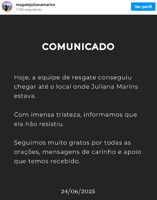 A informação foi confirmada pela família por meio de uma página criada no Instagram para divulgar o caso de Juliana Martins, que sofreu queda enquanto fazia trilha no vulcão e desde então estava desaparecida.