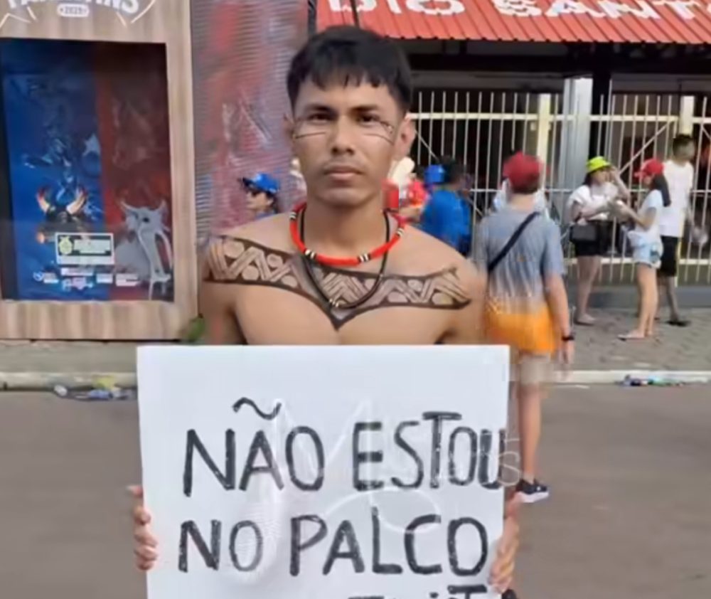 O indígena completou: “Milhares de pessoas viajam pra cá pra viver um espetáculo. Eu viajei pra lembrar que a nossa realidade não é cenográfica. Enquanto muitos vivem a fantasia, eu continuo lutando.”
