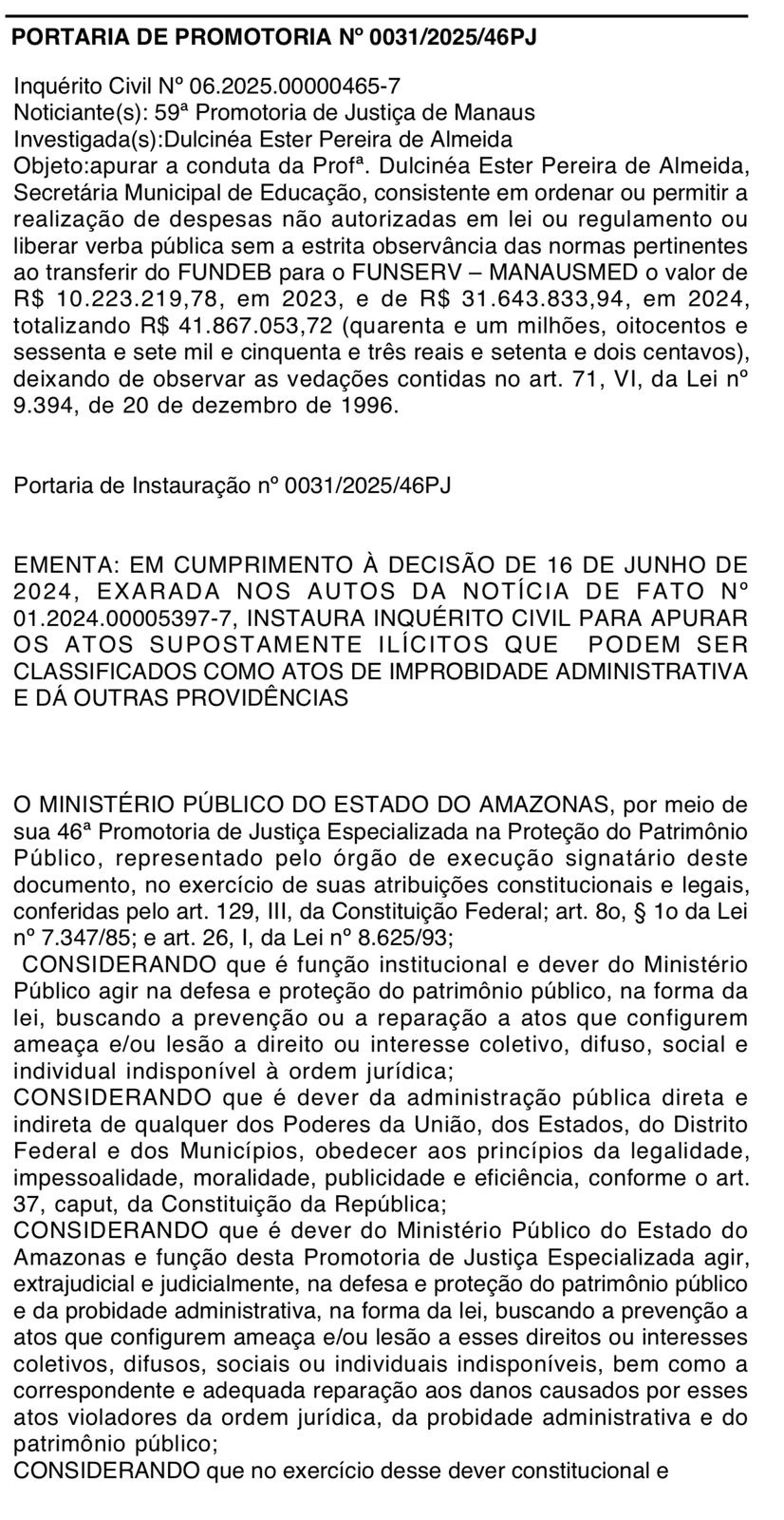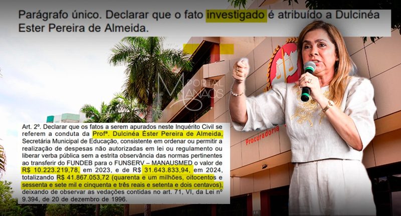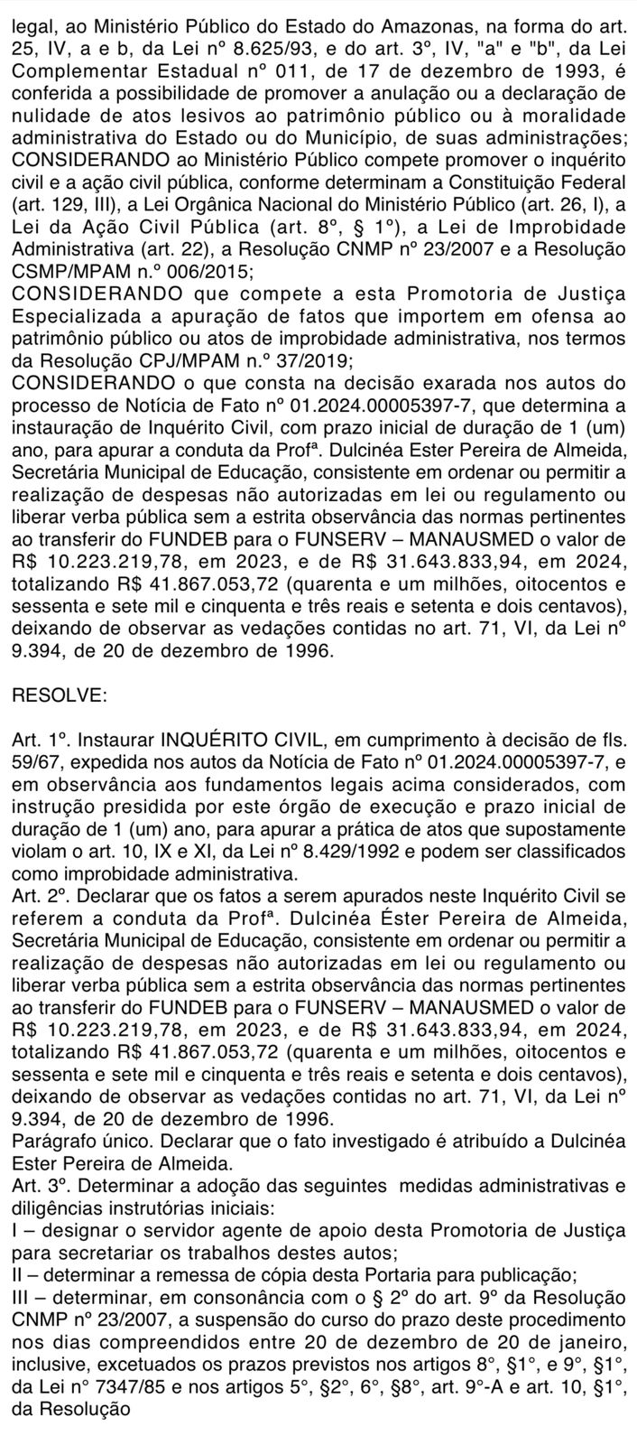 O Ministério Público do Amazonas (MPAM) instaurou um inquérito civil para investigar a atuação da ex-secretária municipal de Educação de Manaus, Dulce Almeida, por suspeita de repasses ilegais de recursos do Fundo de Manutenção e Desenvolvimento da Educação Básica (Fundeb). A informação foi publicada no Diário do MPAM, na edição do dia 3 de julho.