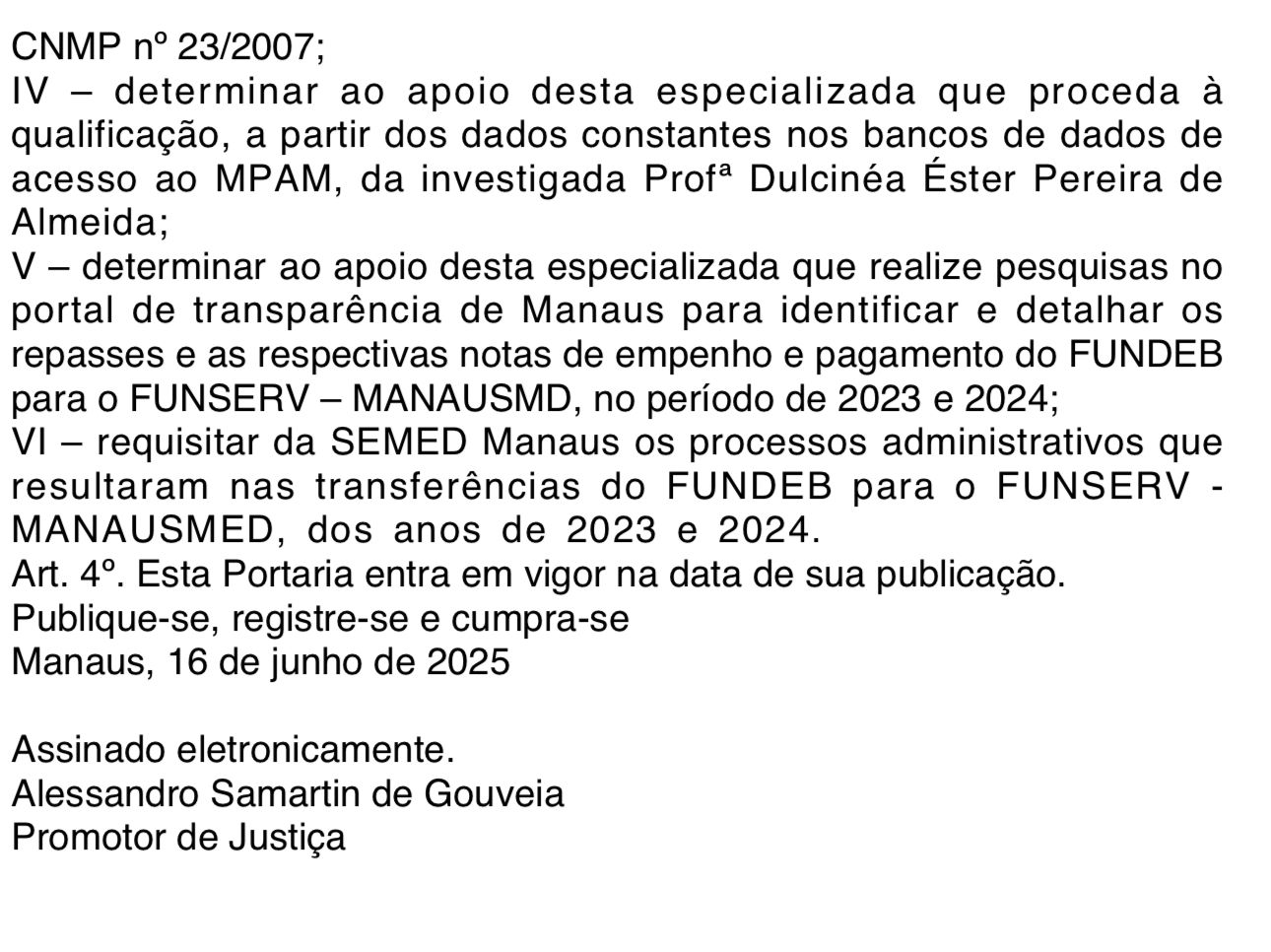 Com a denúncia, originada pela notícia de fato nº 01.2024.00005397-7, o MPAM instaurou um inquérito civil para apurar o caso, no prazo inicial de 1 ano. Como parte da apuração, o MP determinou que a Secretaria Municipal de Educação (Semed) envie toda a documentação comprobatória das transferências efetuadas do Fundeb para o Funserv.