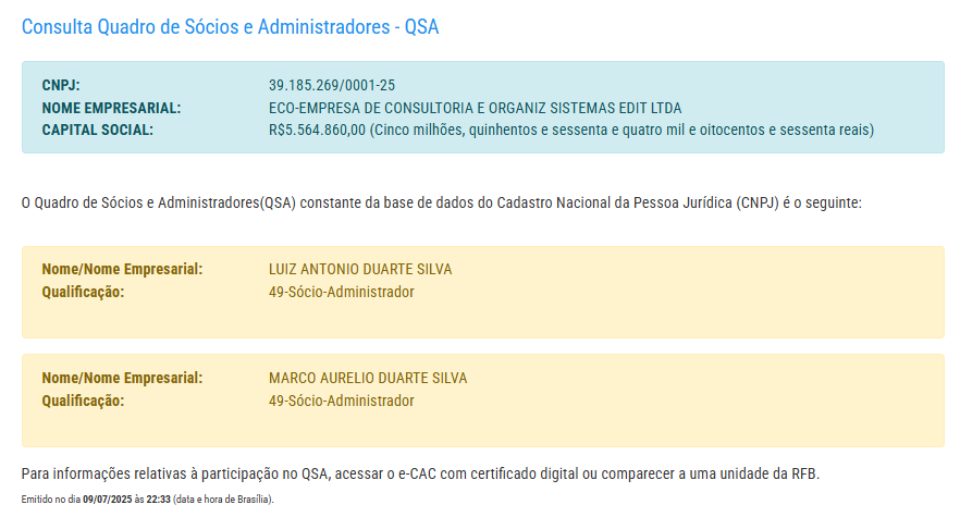 A empresa tem como sócios-administradores Luiz Antônio Duarte Silva e Marco Aurélio Duarte Silva, conforme consta nos registros da Receita Federal.