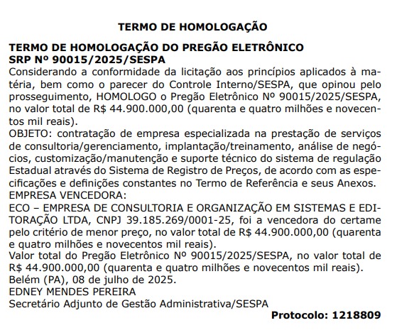 Conforme consta na publicação, o contrato está vinculado ao pregão eletrônico nº 90015/2025, conduzido pela Sespa. Segundo o documento, o processo licitatório atendeu aos princípios legais vigentes e recebeu parecer favorável do setor de Controle Interno da secretaria, que opinou pelo prosseguimento do contrato.
