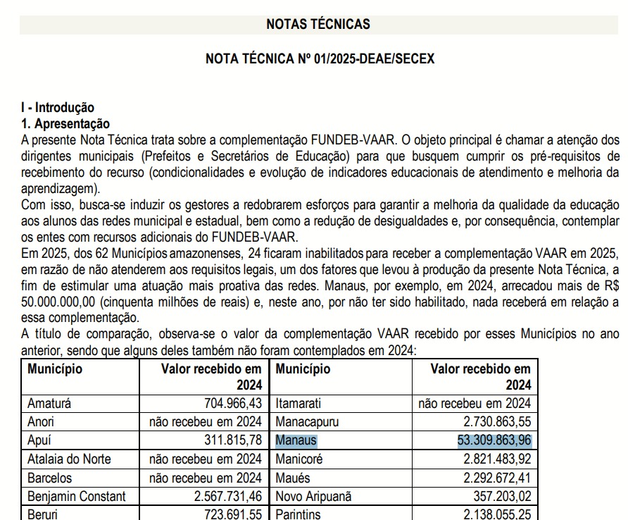 Vale lembrar que, conforme aponta a Nota Técnica nº 01/2025 do Tribunal de Contas do Estado do Amazonas (TCE-AM), Manaus foi excluída da complementação do Fundeb pelo critério VAAR (Valor Aluno Ano por Resultado), deixando de receber cerca de R$ 53 milhões em investimentos na educação. O principal motivo foi o descumprimento dos requisitos mínimos de transparência na aplicação dos recursos educacionais. Confira: