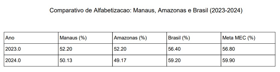Além do desempenho abaixo do esperado, o índice representa uma queda em relação a 2023, quando Manaus havia alcançado 52,2% de alfabetização. Apesar de ter superado a média estadual de 49,17%, a capital amazonense ficou novamente atrás da meta estipulada tanto pelo MEC quanto pelas próprias projeções locais, que previam 56,43% para 2024 e 60,98% para 2025.