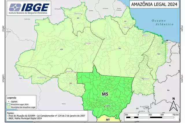 O Instituto Brasileiro de Geografia e Estatística (IBGE) divulgou um mapa da Amazônia Legal com erros nas siglas dos estados de Mato Grosso (MT) e Mato Grosso do Sul (MS), que aparecem invertidas. Além disso, o documento omite a sigla do estado do Acre, identificando apenas sua capital, Rio Branco.