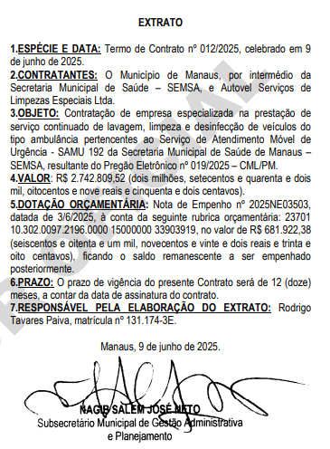 De acordo com a publicação, o valor corresponde ao contrato nº 012/2025, assinado no dia 9 de junho. A autorização da despesa foi assinada pelo subsecretário municipal de Gestão Administrativa e Planejamento, Nagib Salem.