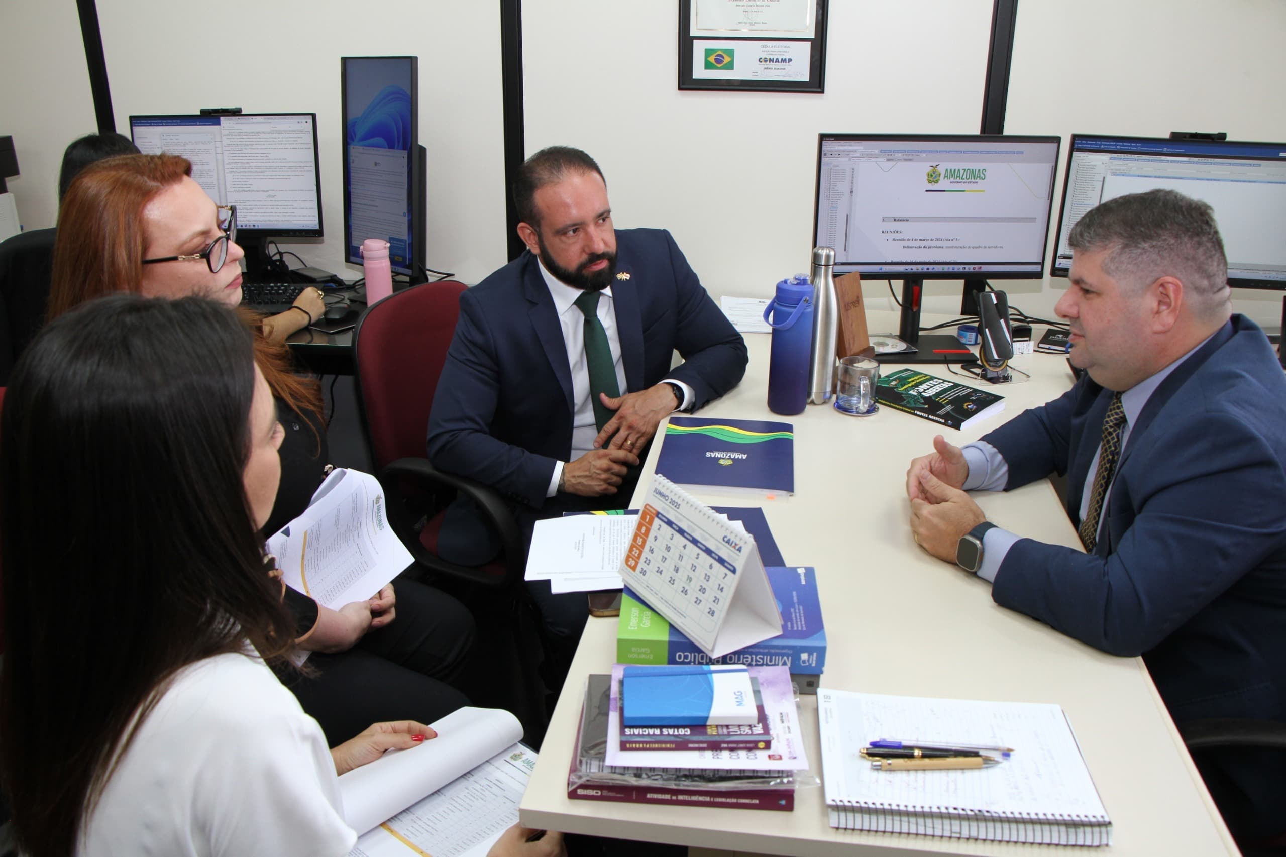 O encontro foi conduzido pelo promotor de Justiça Alessandro Samartin de Gouveia, titular da 46ª Promotoria de Justiça Especializada na Defesa e Proteção do Patrimônio Público (Prodeppp), com a presença de Jalil Fraxe, diretor-presidente do Procon-AM, além de duas diretoras da instituição — Sasha Suano Veiga, diretora técnica, e Cinthia Alencar, diretora administrativa-financeira.