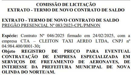 Segundo o documento, o objeto do contrato é o registro de preços para eventual contratação de serviços de fretamento de aeronaves, destinados a atender as demandas da Prefeitura de Nova Olinda do Norte.