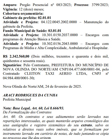 O total de R$ 2.342.560,00 é o valor de um contrato para serviços de táxi aéreo que a prefeita Araci Melo (MDB), de Nova Olinda do Norte (distante 135 quilômetros de Manaus em linha reta), firmou no município. O extrato foi publicado nesta terça-feira, 29, no Diário Oficial dos Municípios do Amazonas (DOM-AM), mas a assinatura ocorreu em 24 de fevereiro de 2025.