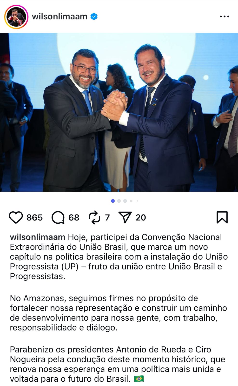 “No Amazonas, seguimos firmes no propósito de fortalecer nossa representação e construir um caminho de desenvolvimento para nossa gente, com trabalho, responsabilidade e diálogo. Parabenizo os presidentes Antonio de Rueda e Ciro Nogueira pela condução deste momento histórico, que renova nossa esperança em uma política mais unida e voltada para o futuro do Brasil”, escreveu o governador, que deve comandar a federação partidária no estado.