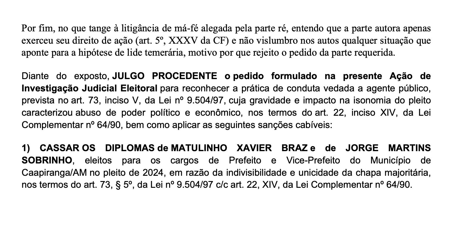 A sentença determina a cassação dos diplomas de Matulinho Braz e Jorge Martins, declarando a nulidade da chapa majoritária eleita em Caapiranga. O magistrado também rejeitou a alegação da defesa de que teria havido litigância de má-fé, ressaltando que a parte autora apenas exerceu seu direito constitucional de ação.