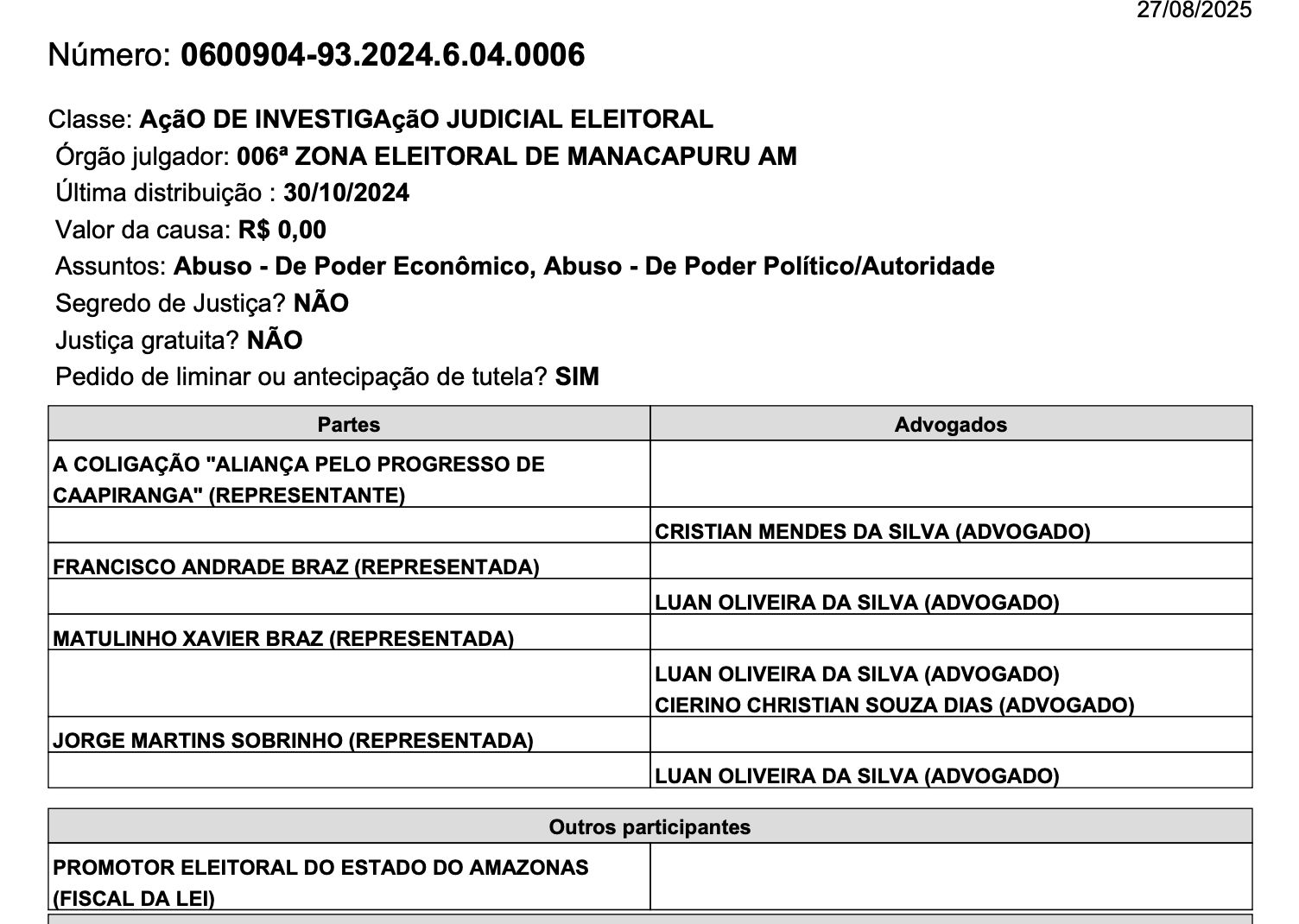 A ação foi movida pela coligação “Aliança pelo Progresso de Caapiranga”, do candidato Francimar Ramalho (MDB), que foi o único adversário de Matulinho na disputa eleitoral do ano passado.