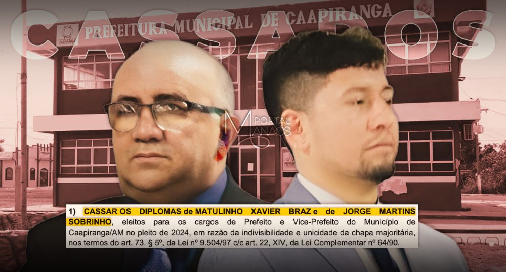 O juiz Marco Aurélio Plazzi Palis, da 6ª Zona Eleitoral de Manacapuru, cassou nesta quarta-feira, 27, os mandatos do prefeito de Caapiranga (AM), Matulinho Braz, e do vice-prefeito Jorge Martins, ambos do União Brasil, por prática de abuso de poder político e econômico durante a eleição municipal de 2024. A decisão acompanha parecer do Ministério Público Eleitoral (MPE).