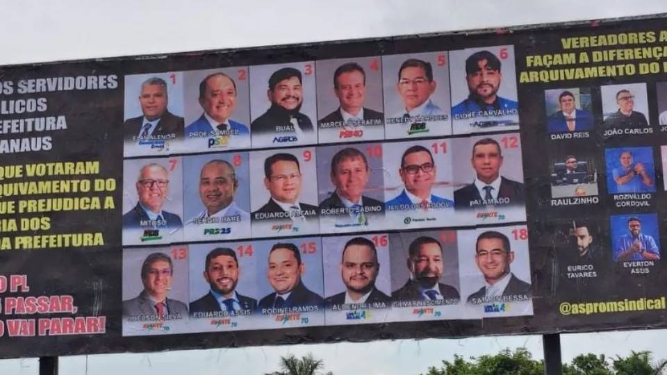 O Sindicato dos Professores e Pedagogos de Manaus (Asprom Sindical) instalou, nesta semana, um outdoor com fotos, nomes e partidos dos vereadores da Câmara Municipal de Manaus (CMM) que votaram contra o arquivamento do Projeto de Lei nº 08/2025, que trata de mudanças nas regras da Previdência dos servidores municipais.