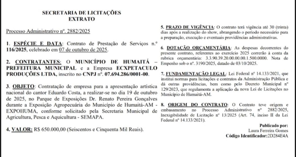 De acordo com o Diário dos Municípios do Amazonas, a gestão do prefeito Dedei Lobo (PL) firmou contrato de R$ 650 mil com o artista, com vigência de 30 dias após a realização do show.
