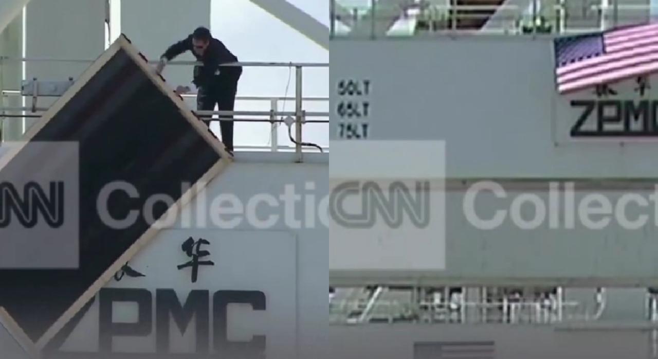 Bandeiras americanas foram usadas para ocultar marca chinesa ZPMC em evento transmitido ao vivo, mas vento expôs o logotipo e gerou repercussão.