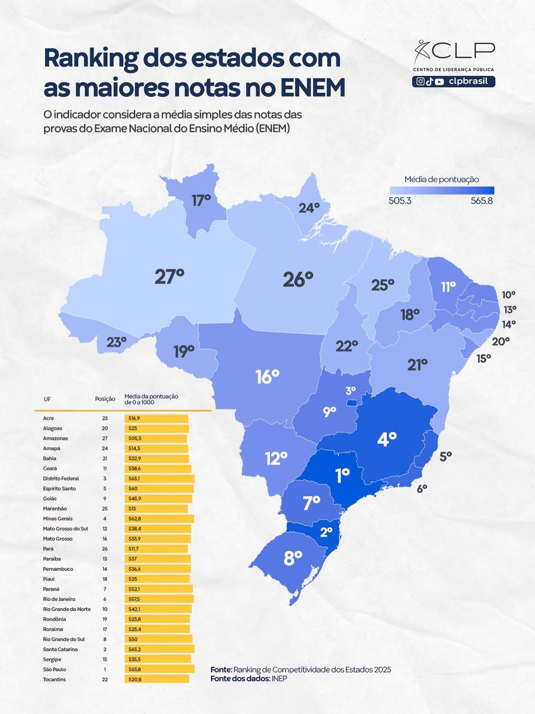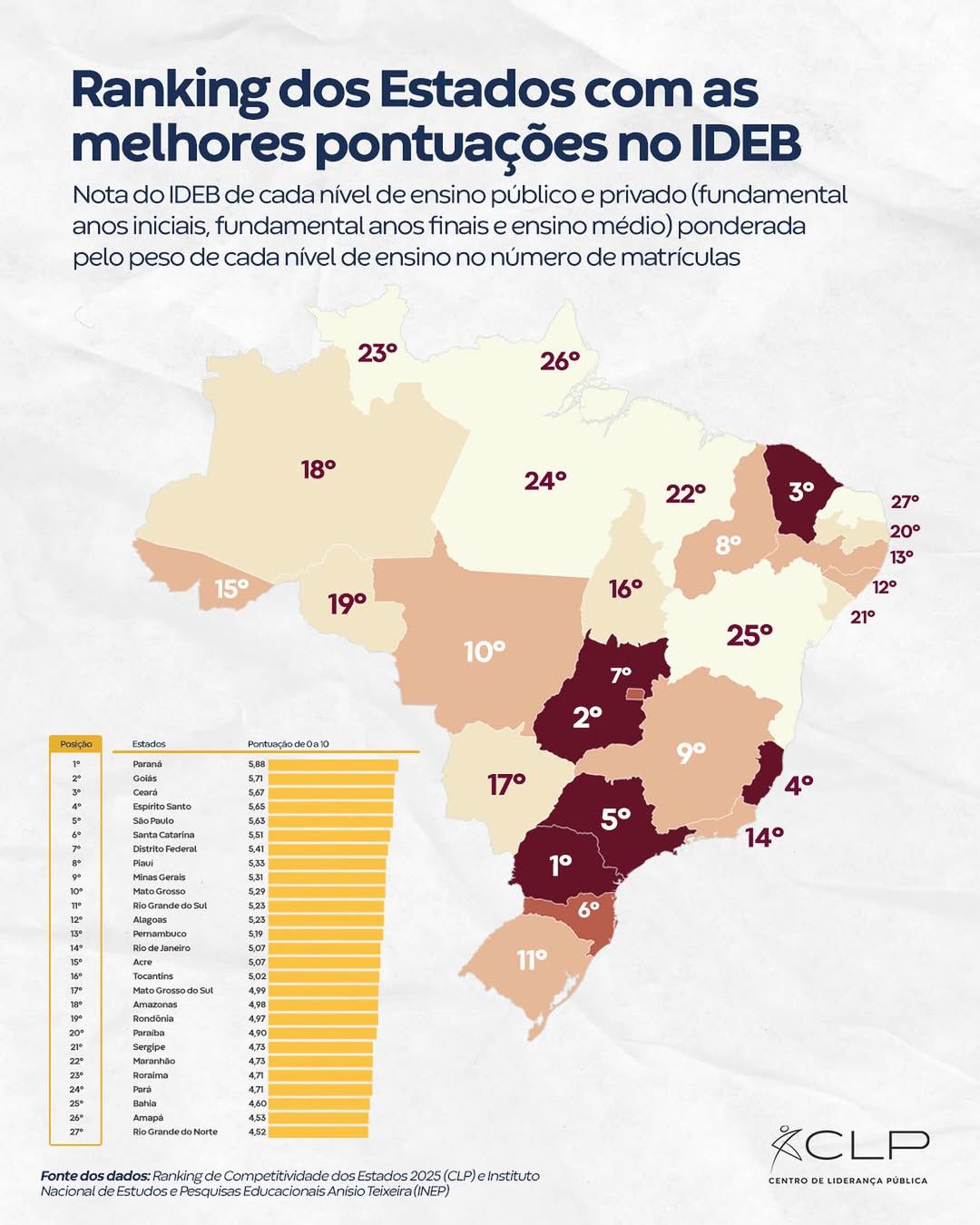Na área da Educação, o Amazonas ocupa o 27º lugar no ranking das melhores notas no Exame Nacional do Ensino Médio (Enem) e o 18º no Índice de Desenvolvimento da Educação Básica (Ideb), conforme o CLP Brasil, com base em dados do Instituto Nacional de Estudos e Pesquisas Educacionais Anísio Teixeira (Inep).