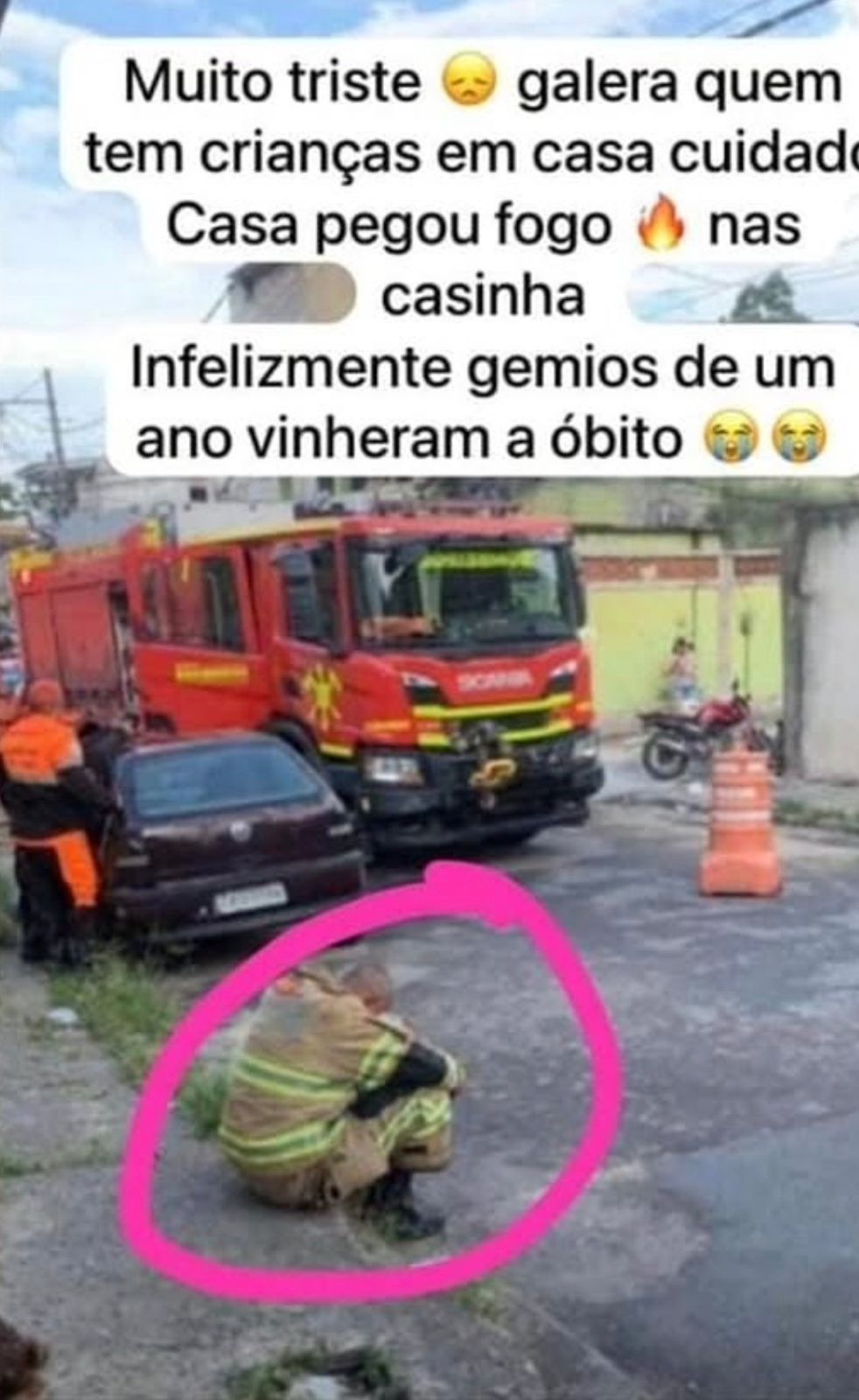 Uma imagem compartilhada nas redes sociais mostra um dos bombeiros que atendeu a ocorrência aos prantos. Inconsolado, o homem é visto agachado em frente à residência das vítimas, após retirar o corpo das crianças do local.