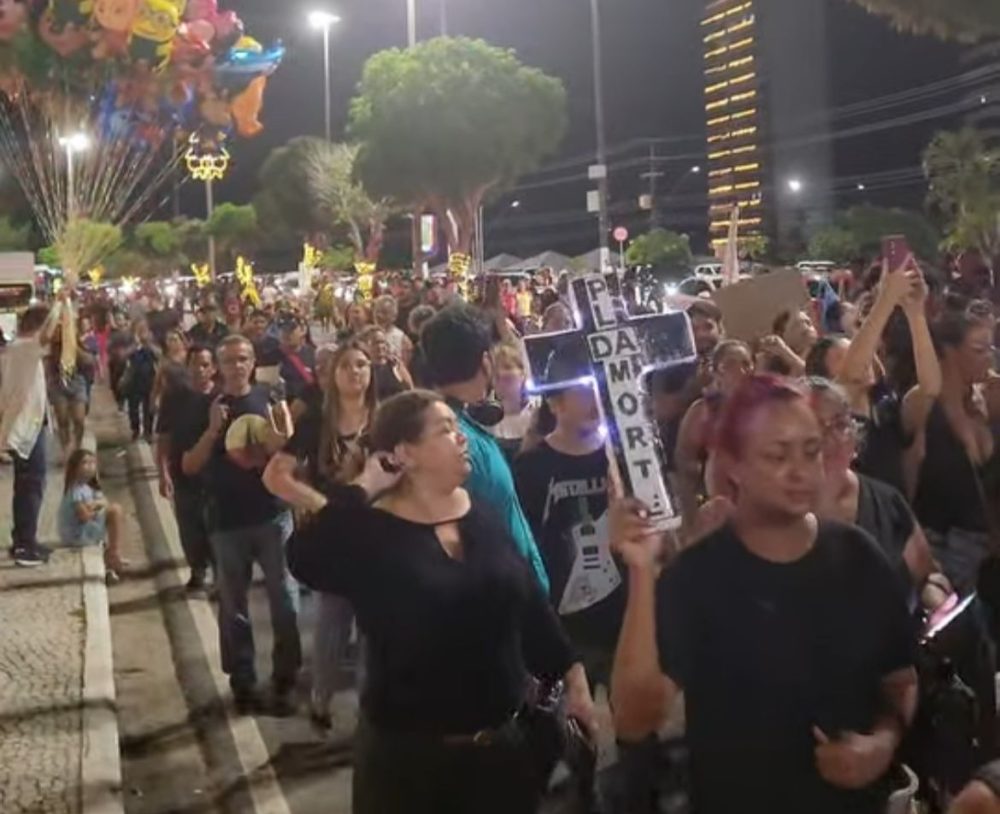 Com cartazes que chamavam a proposta de “PL da Morte” e gritos direcionados ao prefeito David Almeida (Avante), os professores realizaram o ato em frente à Parada Natalina da Prefeitura, evento que contaria com a presença do prefeito — que, no entanto, não compareceu.