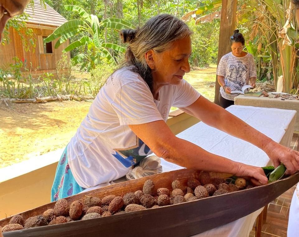 Idealizado pela mestre artesã Arlete Maciel, o projeto tem como eixo central o estudo do processo tradicional de identificação, coleta, higienização e armazenamento das sementes que darão origem às peças artesanais produzidas na Escola de Arte e Saberes Florestais Jardim da Natureza, na comunidade Vila Céu do Mapiá. Nesta fase, as vivências tiveram como foco as sementes da Uxirana (Vantanea parviflora) e do Marajá-Mirim (Bactris maraja).