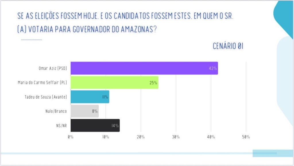 Segundo a pesquisa, Maria do Carmo soma 25% das intenções de voto, atrás do senador Omar Aziz (PSD), que aparece com 42%. O vice-governador Tadeu de Souza (Avante) apareceu na terceira posição, com 11%.