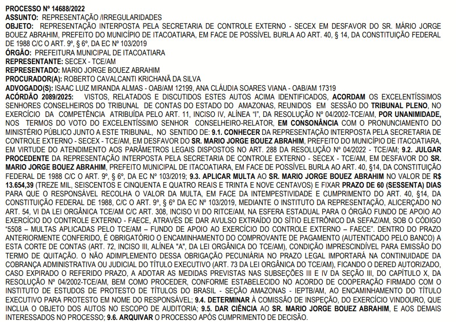 O Tribunal de Contas do Estado do Amazonas (TCE-AM) julgou procedente uma representação contra o prefeito de Itacoatiara, Mário Jorge Bouez Abrahim (Republicanos), por possível burla a dispositivos da Constituição Federal e da Reforma da Previdência.