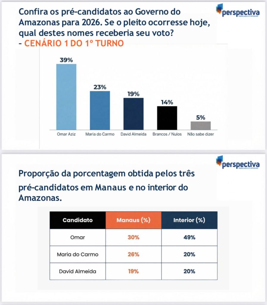 No cenário estimulado para o primeiro turno, Omar Aziz lidera com 39% das intenções de voto, seguido pela professora Maria do Carmo (PL), com 23%, e pelo prefeito de Manaus, David Almeida (Avante), com 19%. Brancos, nulos e indecisos somam 19% dos entrevistados.