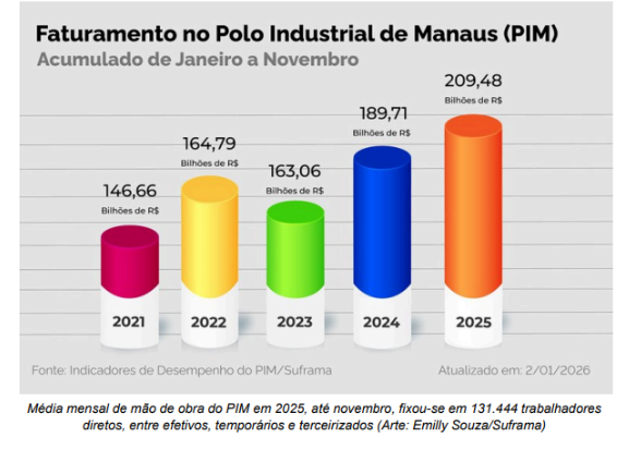 O Polo Industrial de Manaus acaba de atravessar uma linha simbólica — e histórica. Em 2025, o faturamento do PIM superou a casa dos R$ 200 bilhões e, mais do que isso, até novembro já havia ultrapassado todo o resultado de 2024. Não é detalhe estatístico. É sinal claro de que a indústria amazônica está jogando em outra prateleira.
