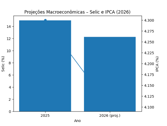 A inflação tende a seguir mais comportada, com IPCA projetado em torno de 4,1% em 2026, abaixo do teto da meta.