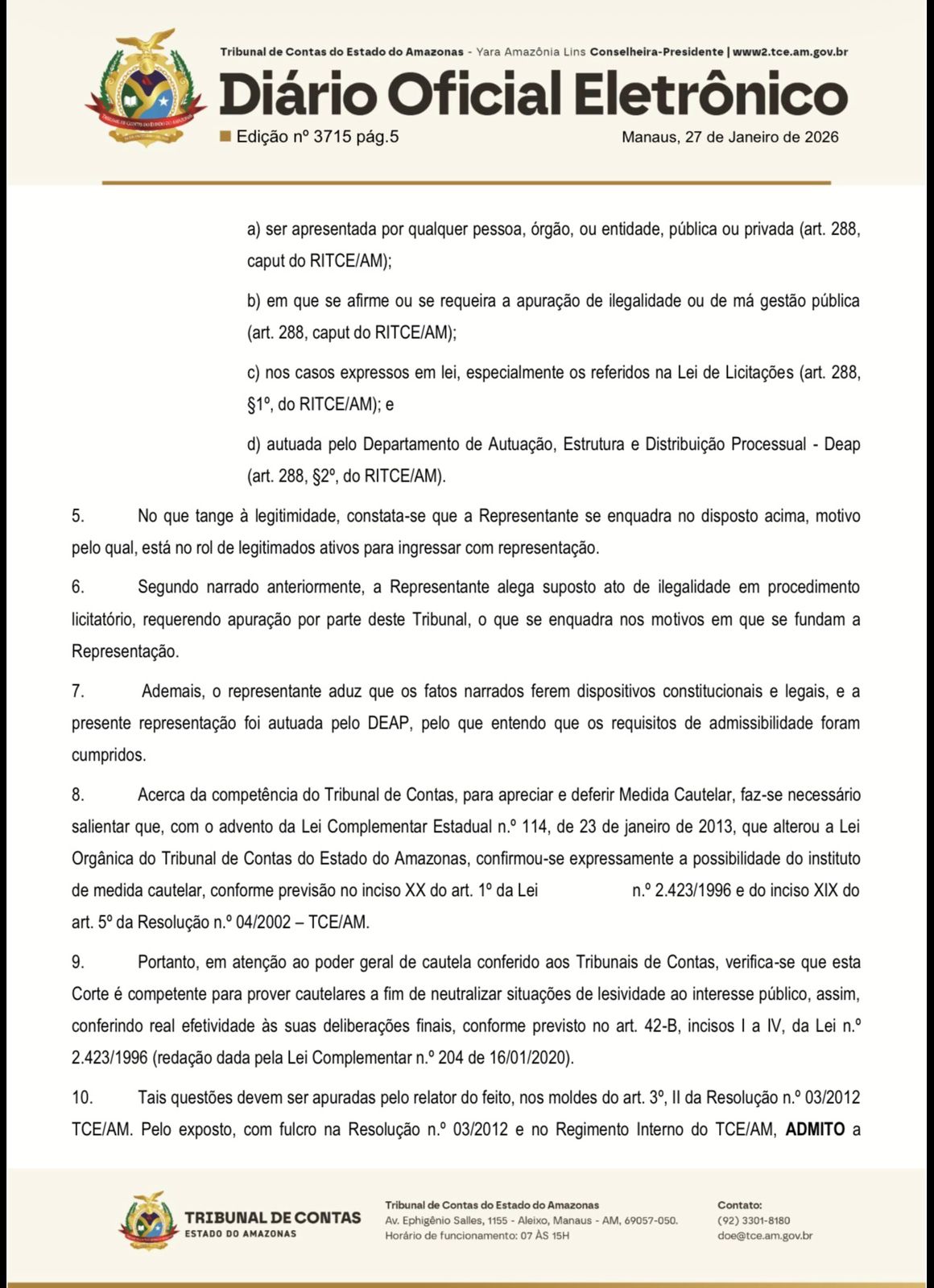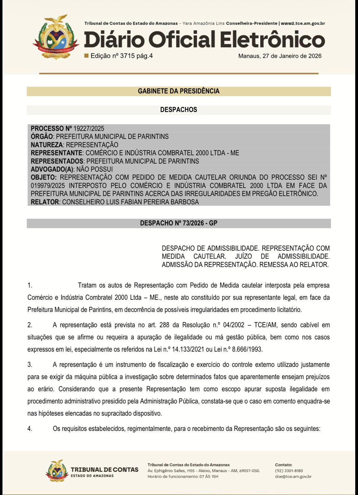 O Tribunal de Contas do Estado do Amazonas (TCE-AM) admitiu uma representação com pedido de medida cautelar contra a Prefeitura de Parintins, sob gestão do prefeito Mateus Assayag (PSD), após denúncia de possíveis irregularidades em um pregão eletrônico conduzido pela administração municipal. A decisão consta no Diário Oficial Eletrônico do Tribunal, edição de 27 de janeiro.