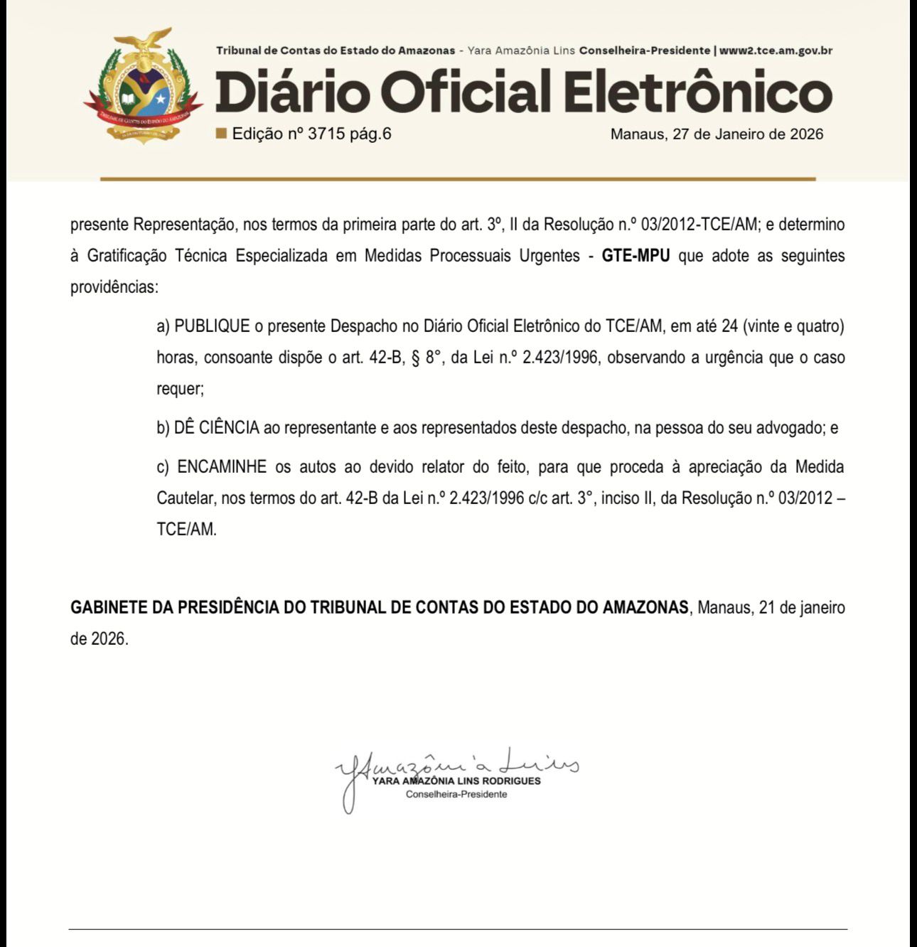 No despacho, assinado pela conselheira-presidente Yara Amazônia Lins Rodrigues, o TCE-AM reconhece que a denúncia atende aos requisitos formais de admissibilidade previstos no Regimento Interno da Corte e na legislação vigente, incluindo a Lei de Licitações.