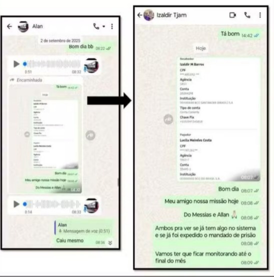 Outro conjunto de mensagens, datado de 2 de setembro de 2025, mostra diálogo entre Lucila e Allan Kleber Bezerra Lima, apontado pelos investigadores como líder do núcleo político e considerado foragido após a operação. Nos prints, Lucila afirma ter falado minutos antes com Izaldir, indicando possível articulação entre os envolvidos.