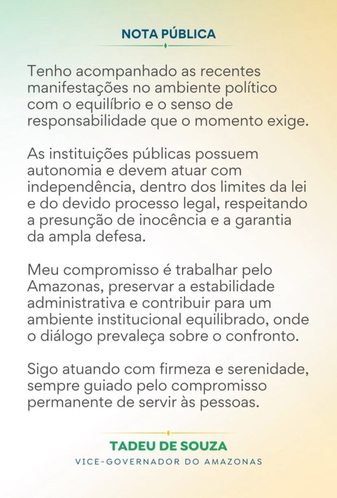 “Meu compromisso é trabalhar pelo Amazonas, preservar a estabilidade administrativa e contribuir para um ambiente institucional equilibrado, onde o diálogo prevaleça sobre o confronto”, escreveu nas redes sociais.