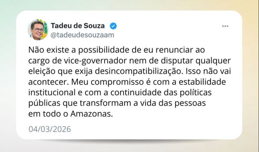 Tadeu reforçou que sua prioridade é garantir a continuidade das políticas públicas e a estabilidade administrativa no estado, sem mudanças no atual cenário político. “Não existe a possibilidade de eu renunciar ao cargo de vice-governador nem de disputar qualquer eleição que exija desincompatibilização. Isso não vai acontecer. Meu compromisso é com a estabilidade institucional e com a continuidade das políticas públicas que transformam a vida das pessoas em todo o Amazonas”, declarou.