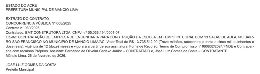 De acordo com o documento, a obra será de R$ 13,7 milhões, para a construção de uma unidade com 13 salas de aula no bairro São Francisco. O contrato, decorrente da Concorrência Pública nº 008/2025, terá vigência de 12 meses. O contrato foi assinado pelo prefeito José Luiz Gomes da Costa.