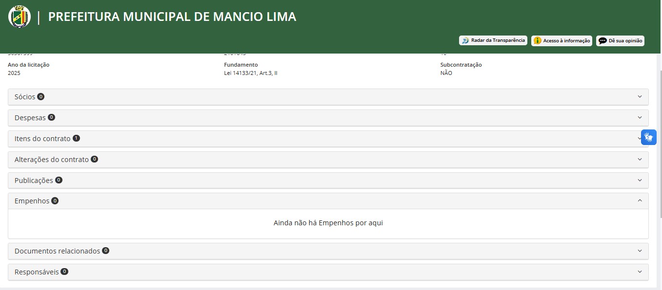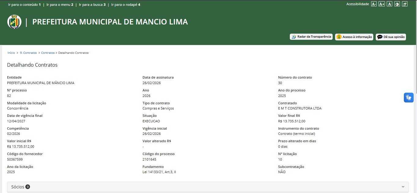 O valor do contrato chama atenção quando comparado ao porte do município. Segundo dados do Instituto Brasileiro de Geografia e Estatística (IBGE), Mâncio Lima possui cerca de 19.294 habitantes, conforme o Censo de 2022.