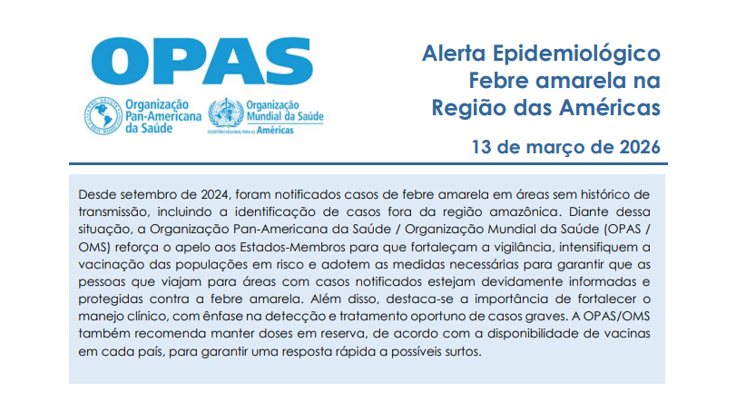 A Organização Pan-Americana da Saúde e a Organização Mundial da Saúde (OPAS / OMS) emitiram um alerta após a identificação de casos de febre amarela em regiões sem registro prévio de transmissão, incluindo localidades fora da região amazônica. O alerta foi divulgado no dia 13 de março.