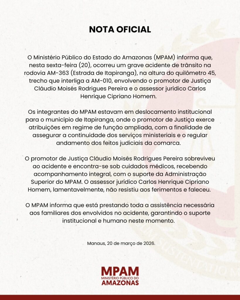 Em nota, o Ministério Público do Amazonas informou que está prestando assistência aos familiares. “O MP-AM informa que está prestando toda a assistência necessária aos familiares dos envolvidos no acidente, garantindo o suporte institucional e humano neste momento”, diz o comunicado.