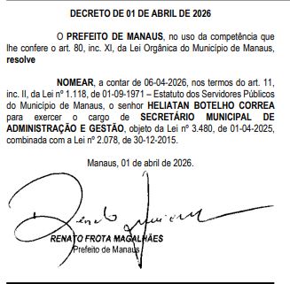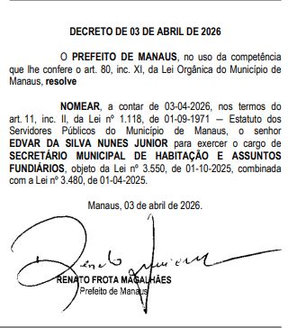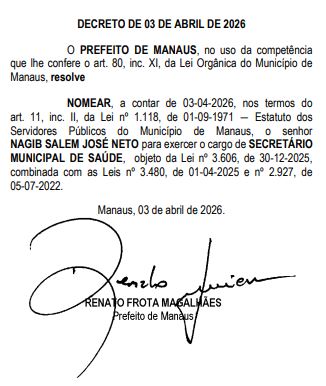 Na área da saúde, Nagib Salem José Neto foi designado para a Secretaria Municipal de Saúde (Semsa). Já a Secretaria Municipal de Habitação e Assuntos Fundiários (Semhaf) será conduzida por Edvar da Silva Nunes Junior.