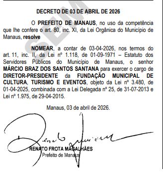 Na cultura, Márcio Braz dos Santos Santana assume a Fundação Municipal de Cultura, Turismo e Eventos (Manauscult). Para a Secretaria Municipal de Educação (Semed), o prefeito nomeou Arone do Nascimento Bentes, que já integrava a estrutura da pasta.