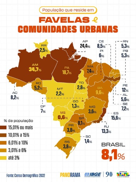 No cenário nacional, o levantamento identificou 12.348 favelas e comunidades urbanas, onde vivem 16,39 milhões de pessoas, o equivalente a 8,1% da população brasileira. Em 2010, eram 6.329 localidades e 11,4 milhões de moradores (6%), o que evidencia um crescimento significativo tanto em número de áreas quanto de habitantes.