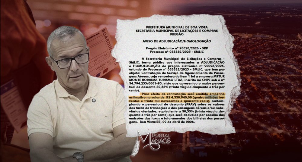 A Prefeitura de Boa Vista, de Roraima, homologou um contrato estimado em R$ 4.330.940,00 para a contratação de serviços de agenciamento de passagens aéreas e rodoviárias. O resultado do Pregão Eletrônico nº 90028/2026 foi publicado no dia 10 de abril de 2026 no Diário Oficial do Município (DOM), poucos dias após a mudança no comando do Executivo municipal, que agora é comandado pelo prefeito Marcelo Zeitoune (PL).