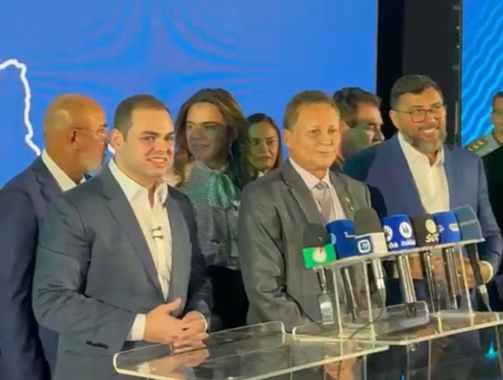 O ex-governador Wilson Lima (União Brasil), o governador interino Roberto Cidade (União Brasil) e o deputado estadual Adjuto Afonso (União Brasil) participaram juntos da abertura do evento e também da coletiva de imprensa realizada na ocasião.